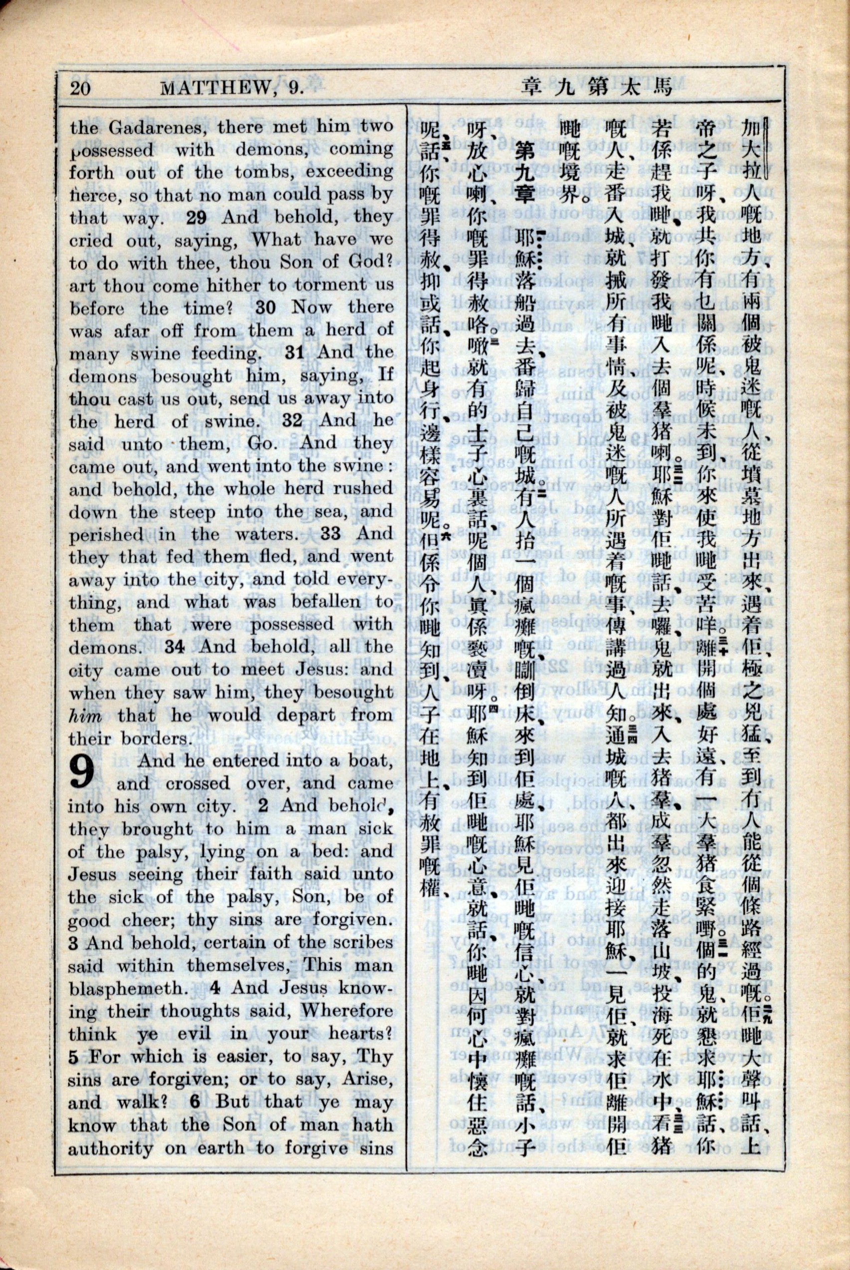 1931年新約全書廣東話新譯本與美國新譯英文 馬太福音 8 章 28 節到 9 章 6 節