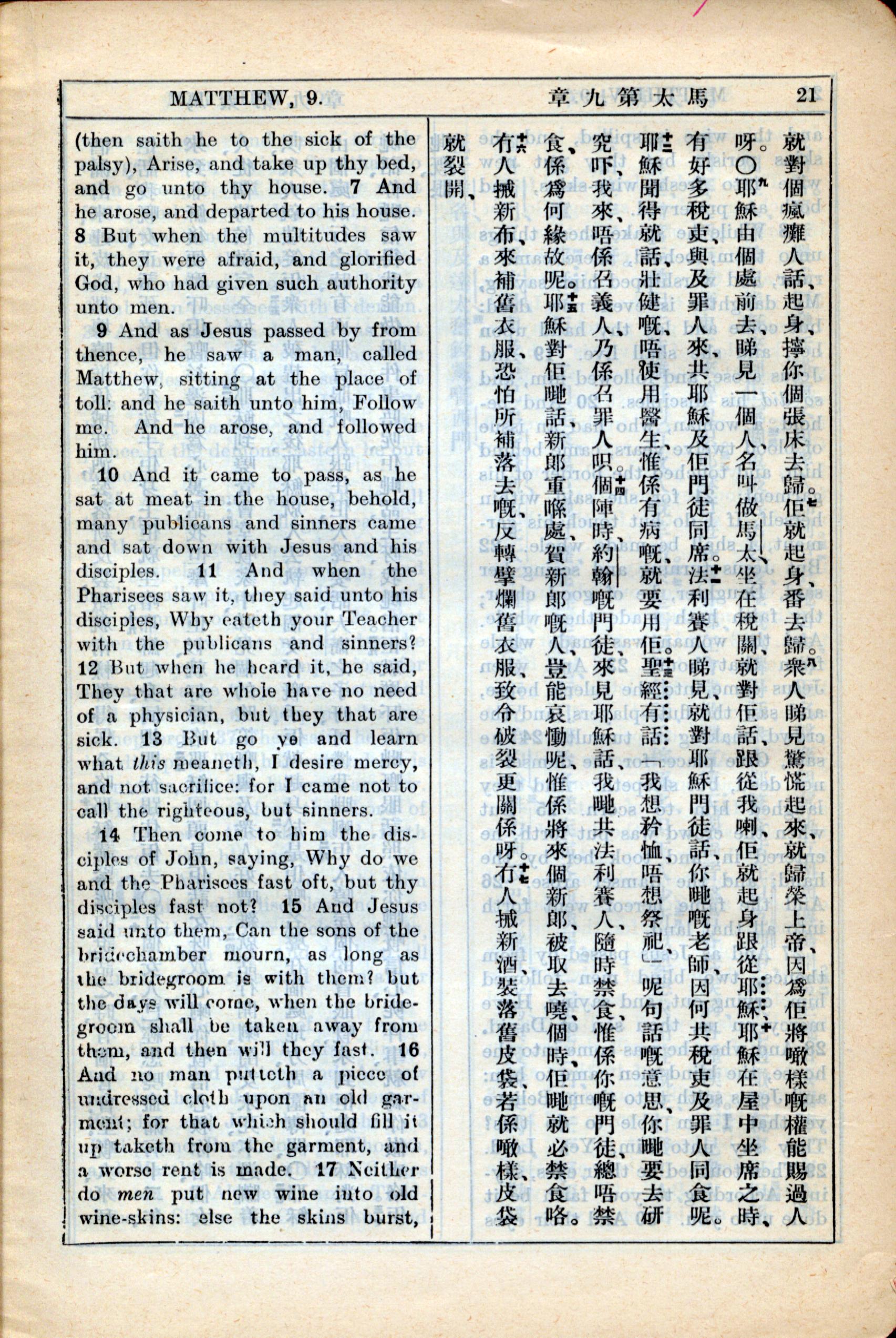 1931年新約全書廣東話新譯本與美國新譯英文 馬太福音 9 章 7 節到 9 章 17 節