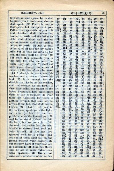 1931年新約全書廣東話新譯本與美國新譯英文 馬太福音 10 章 20 節到 10 章 32 節