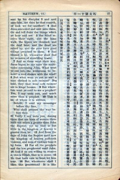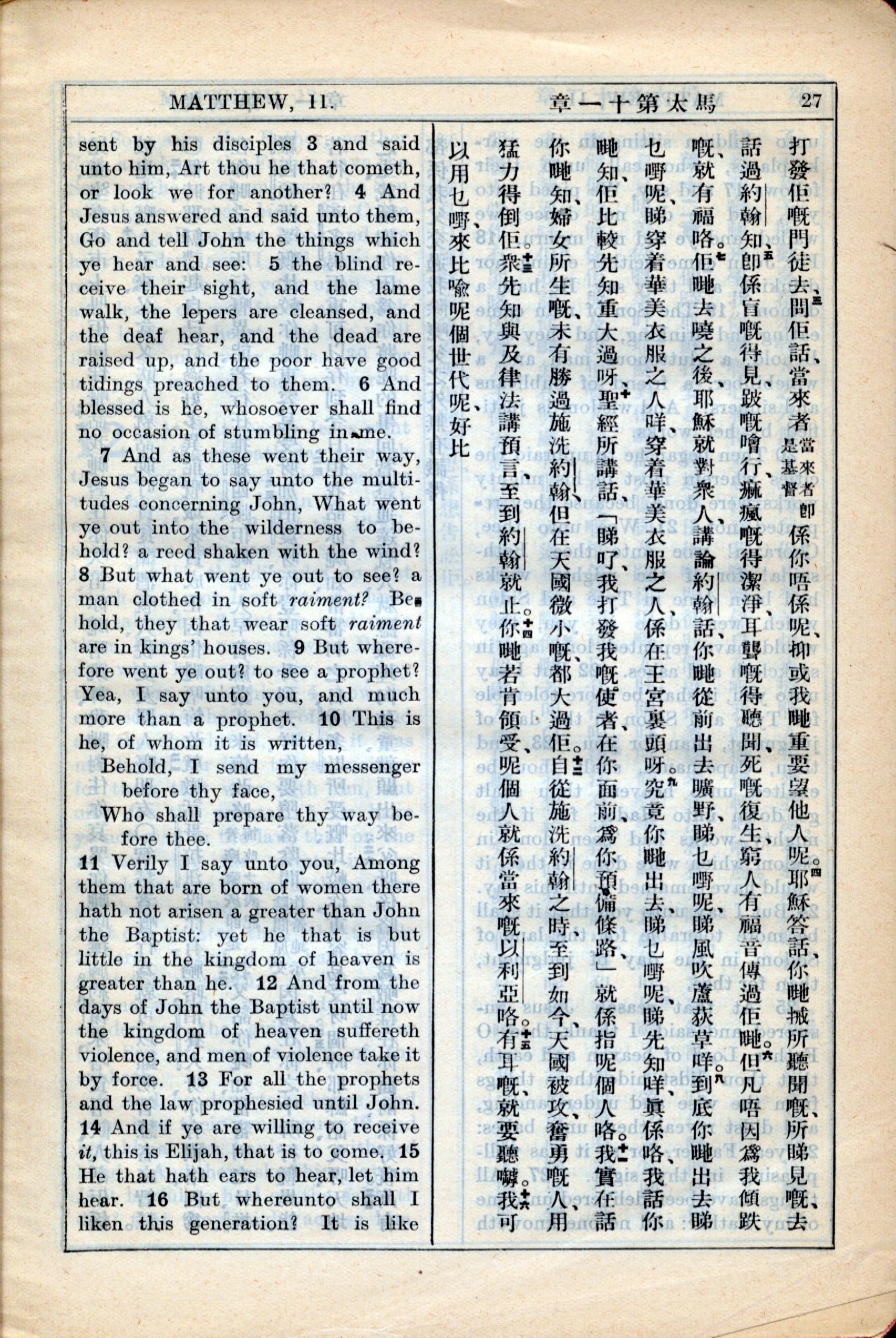 1931年新約全書廣東話新譯本與美國新譯英文 馬太福音 11 章 3 節到 11 章 16 節