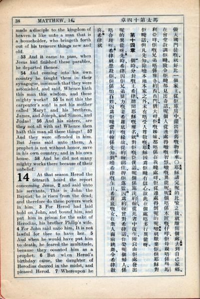 1931年新約全書廣東話新譯本與美國新譯英文 馬太福音 13 章 52 節到 14 章 6 節