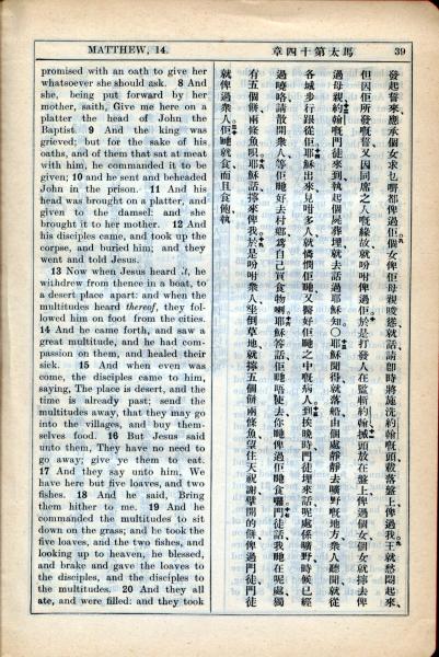 1931年新約全書廣東話新譯本與美國新譯英文 馬太福音 14 章 7 節到 14 章 20 節