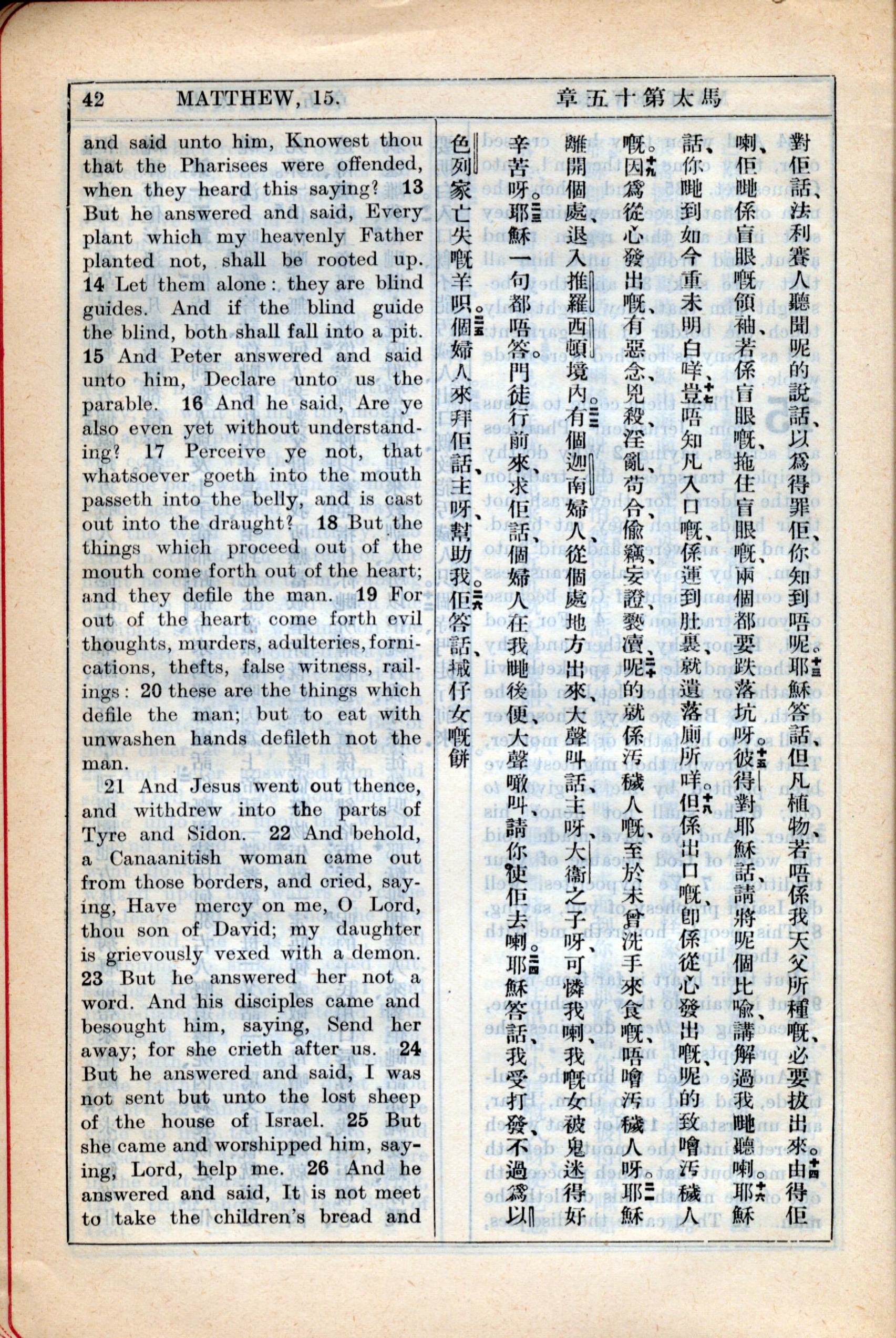 1931年新約全書廣東話新譯本與美國新譯英文 馬太福音 15 章 12 節到 15 章 26 節