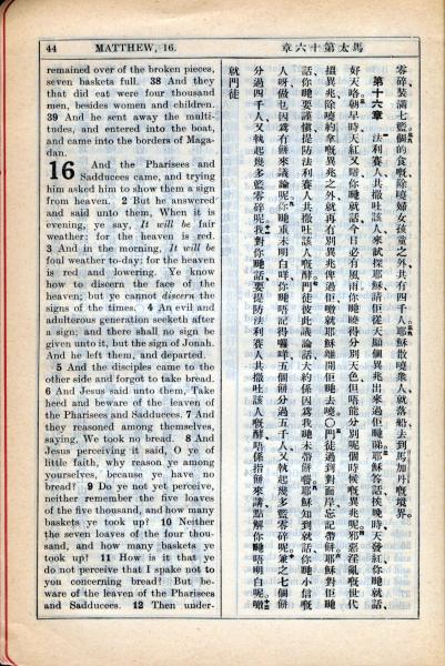 1931年新約全書廣東話新譯本與美國新譯英文 馬太福音 15 章 38 節到 16 章 11 節