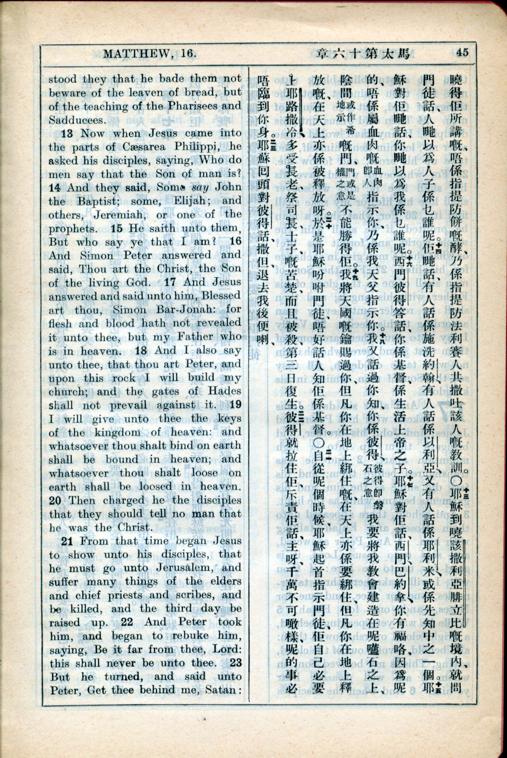 1931年新約全書廣東話新譯本與美國新譯英文 馬太福音 16 章 12 節到 16 章 23 節