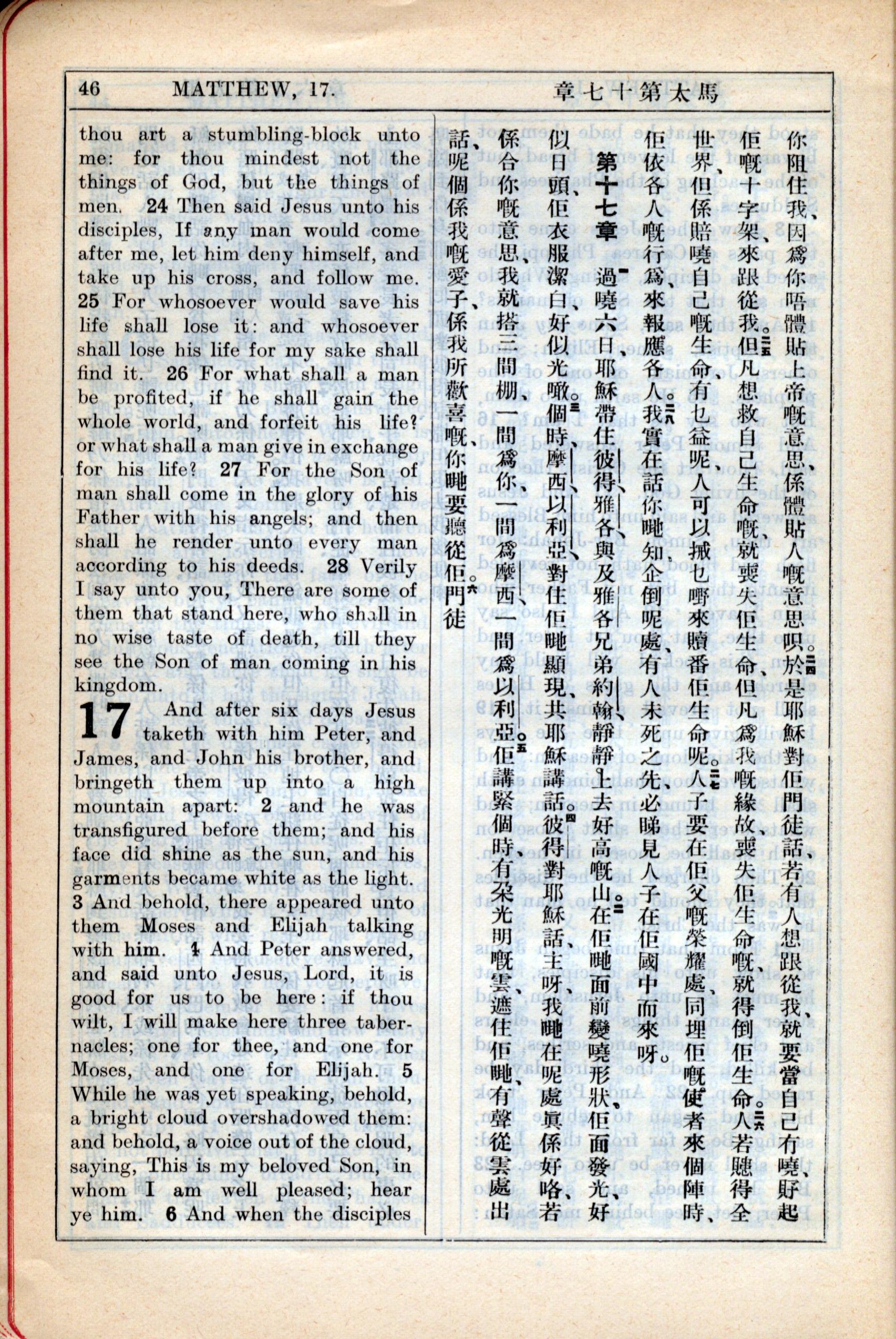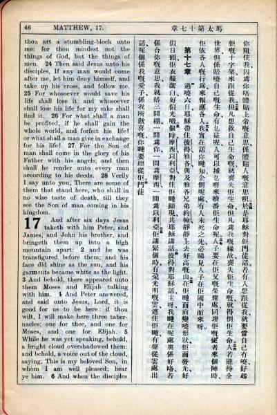 1931年新約全書廣東話新譯本與美國新譯英文 馬太福音 16 章 24 節到 17 章 5 節