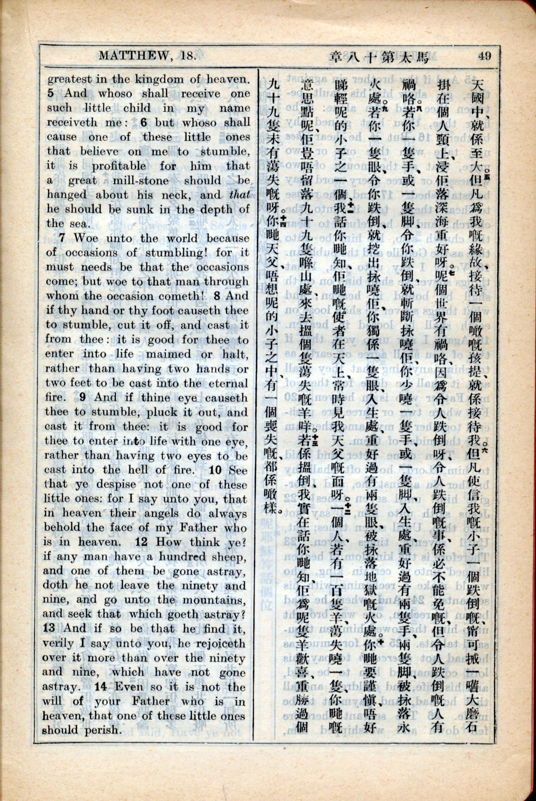 1931年新約全書廣東話新譯本與美國新譯英文 馬太福音 18 章 5 節到 18 章 14 節