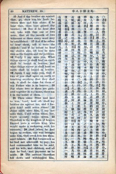 1931年新約全書廣東話新譯本與美國新譯英文 馬太福音 18 章 15 節到 18 章 26 節