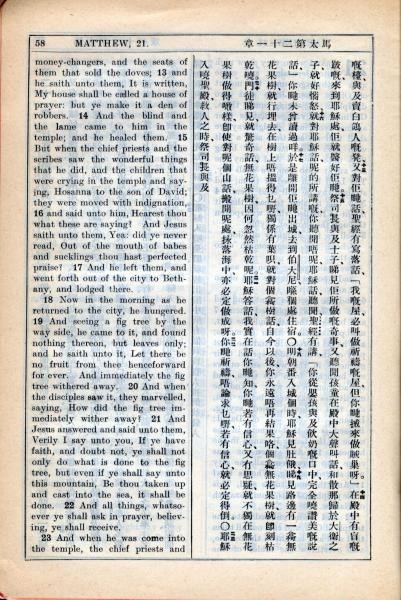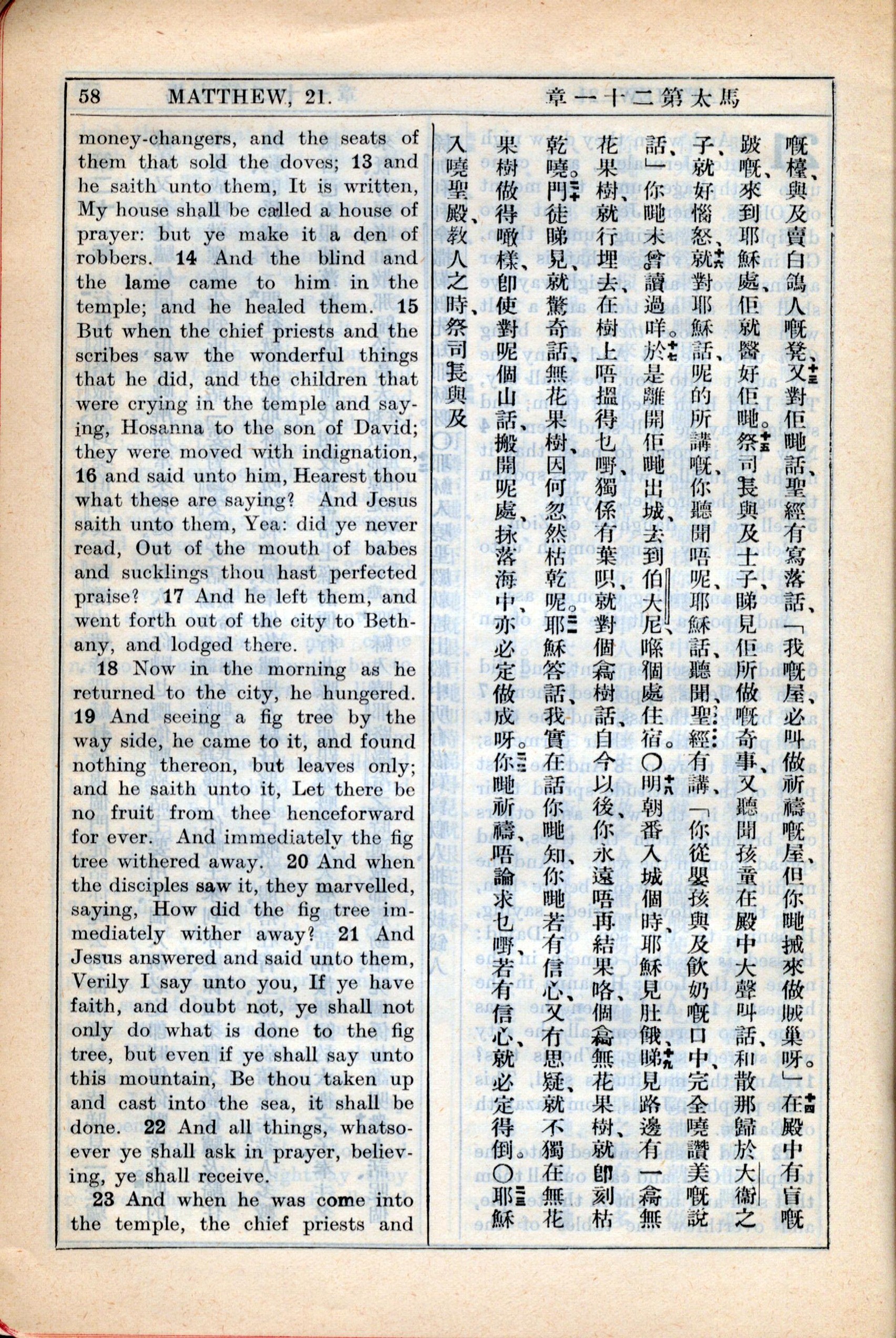 1931年新約全書廣東話新譯本與美國新譯英文 馬太福音 21 章 13 節到 21 章 22 節