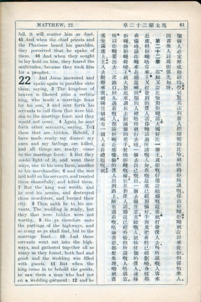 1931年新約全書廣東話新譯本與美國新譯英文 馬太福音 21 章 45 節到 22 章 11 節