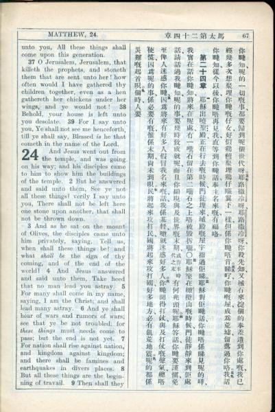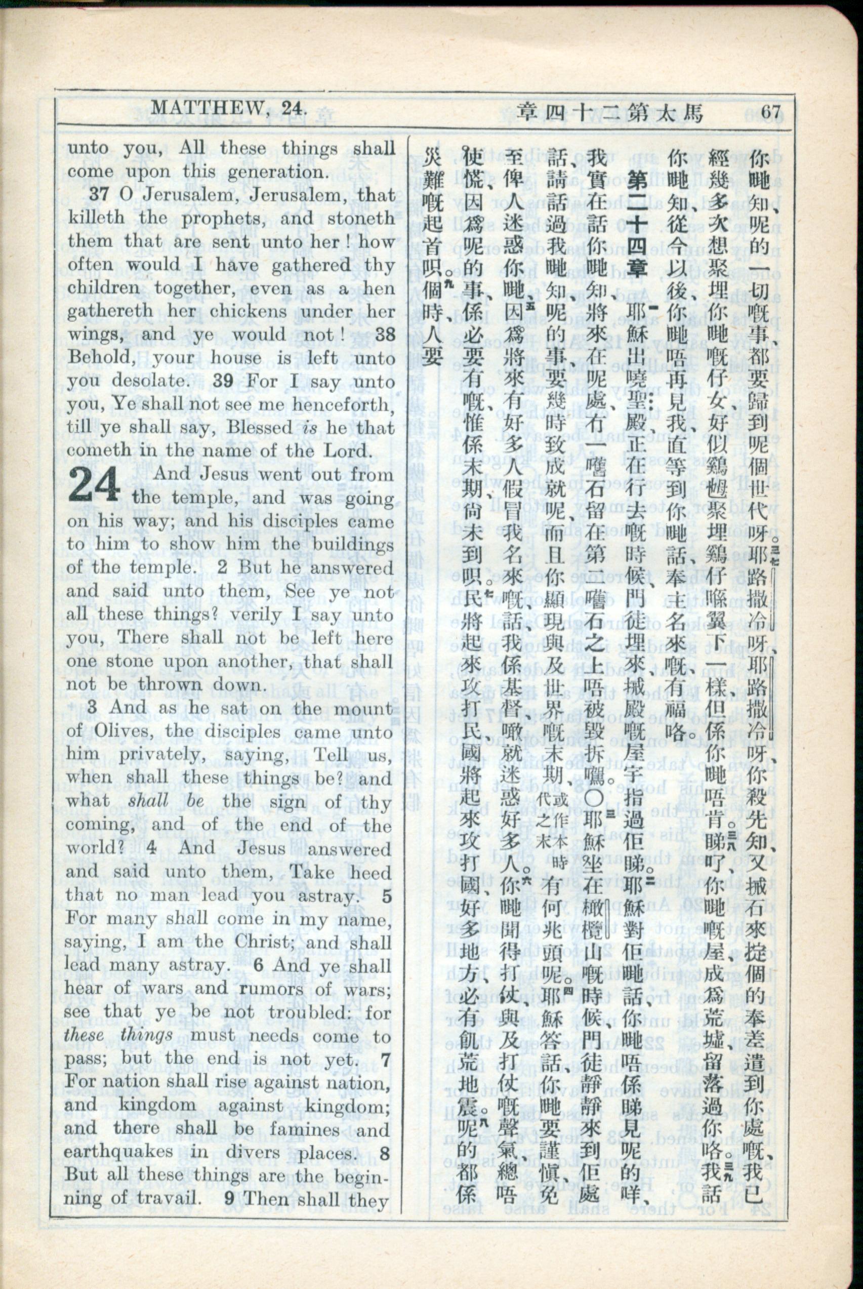 1931年新約全書廣東話新譯本與美國新譯英文 馬太福音 23 章 36 節到 24 章 8 節