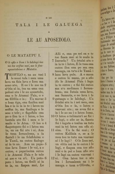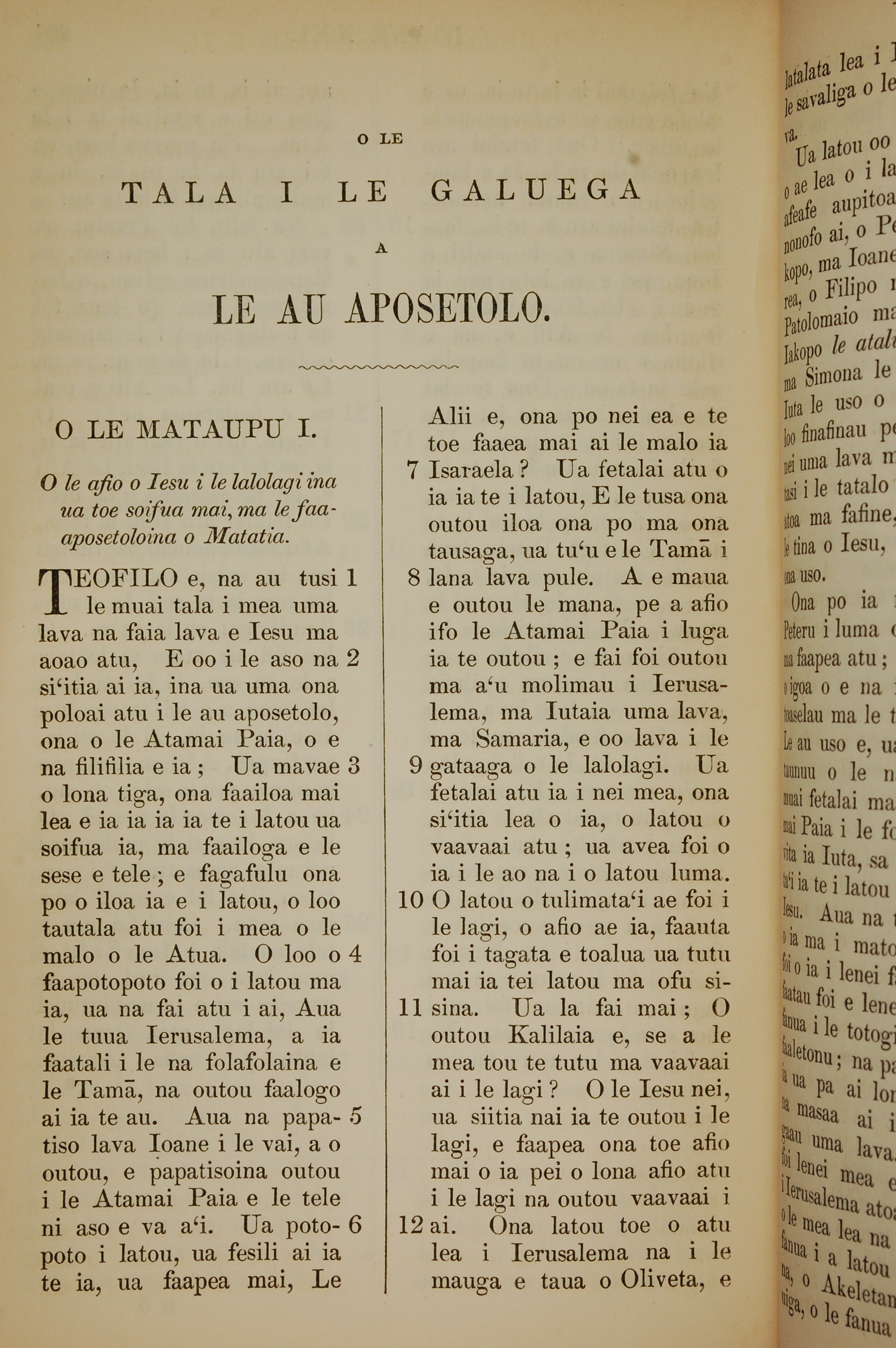 1849年薩摩亞語新約全書 使徒行傳 1 章 1 節到 1 章 12 節