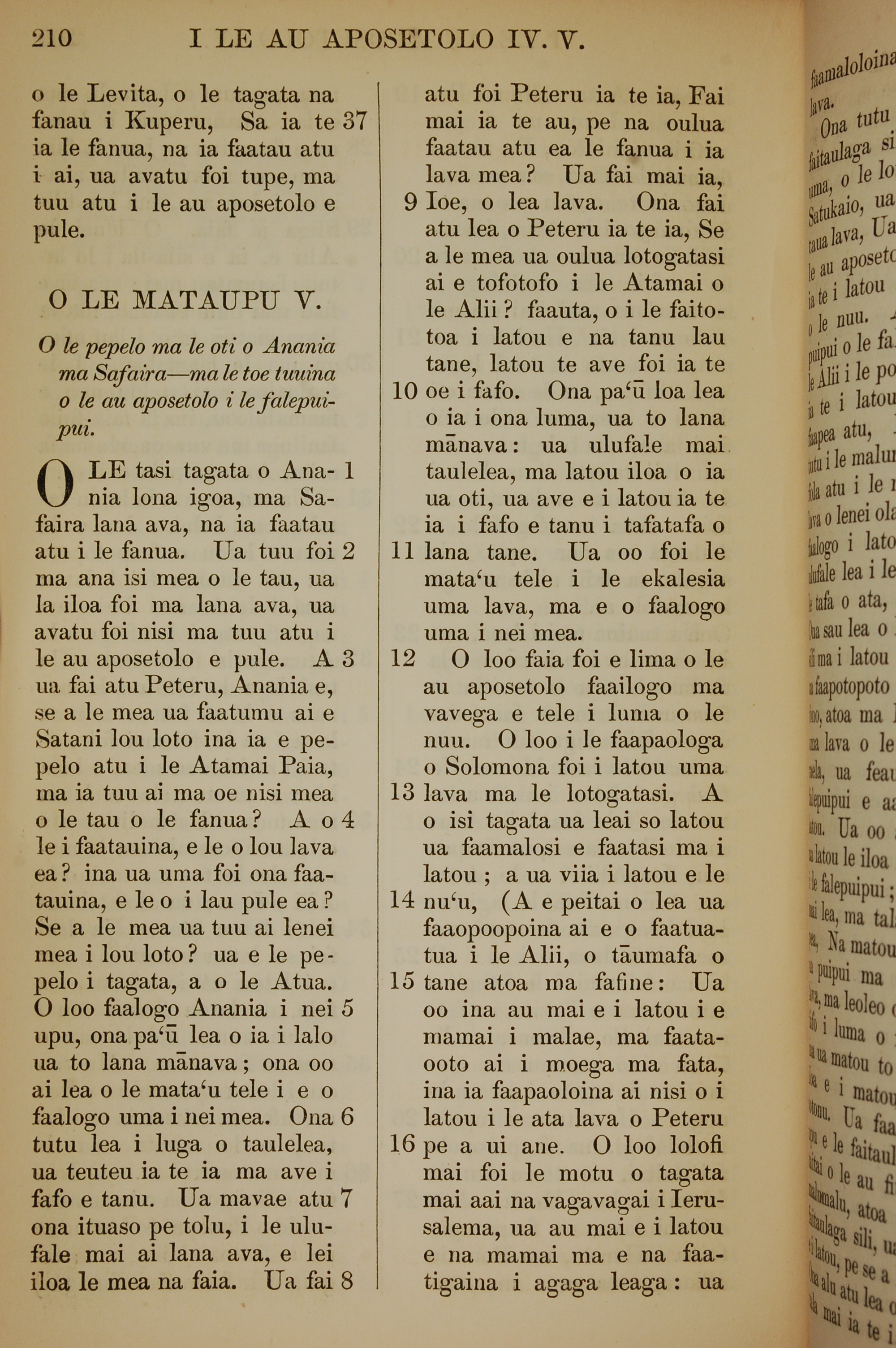 1849年薩摩亞語新約全書 使徒行傳 4 章 37 節到 5 章 16 節