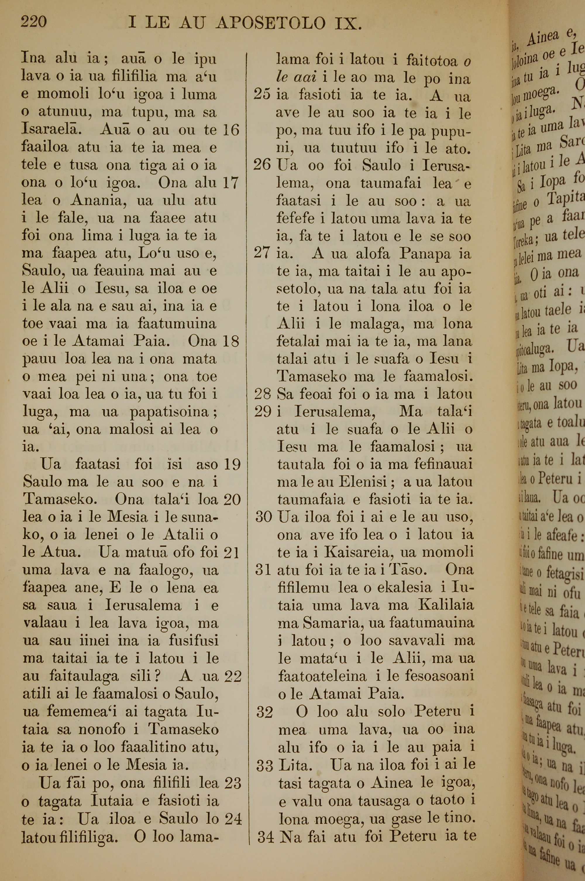 1849年薩摩亞語新約全書 使徒行傳 9 章 16 節到 9 章 34 節